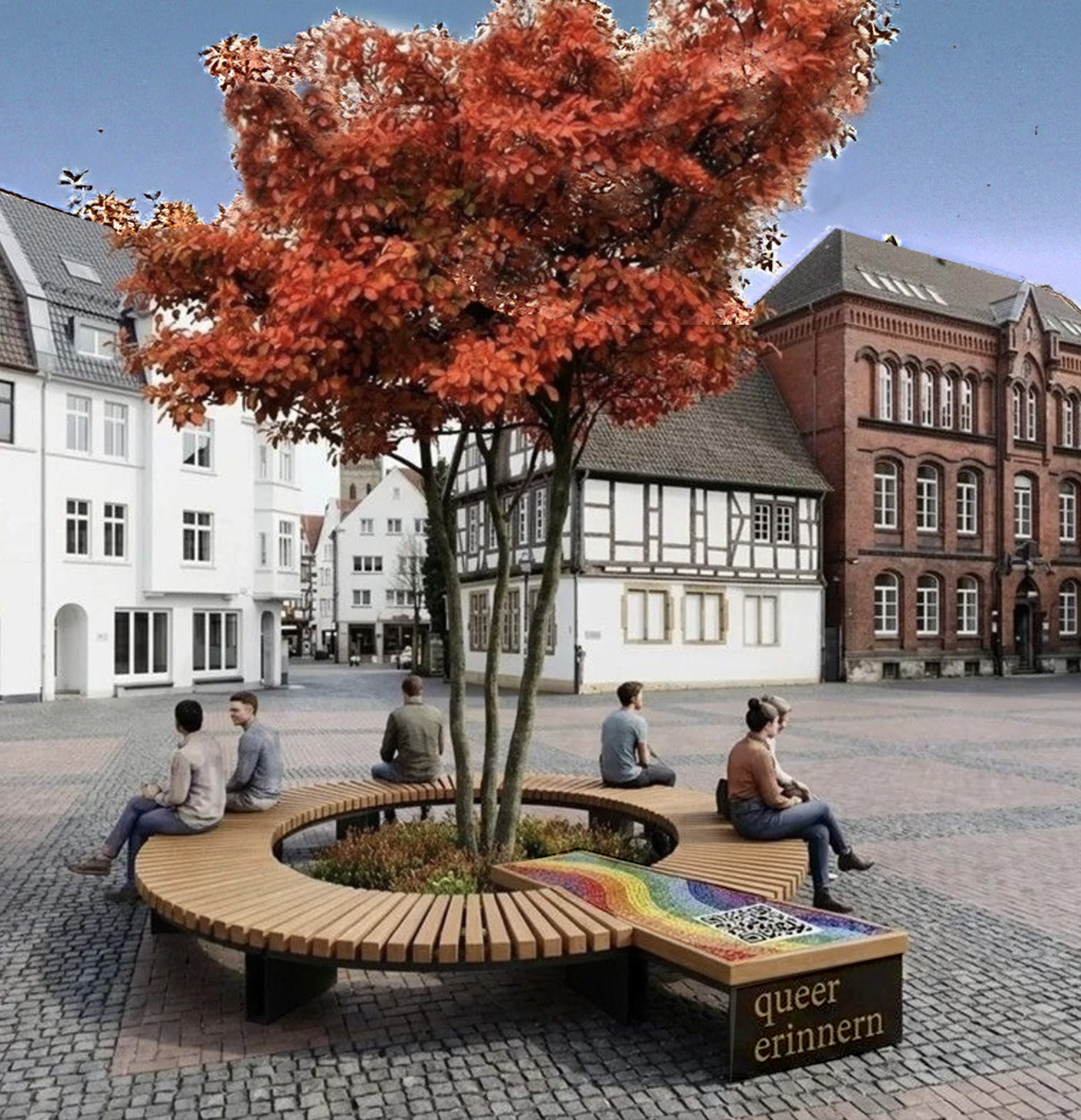 Ein Entwurf unseres Mitglieds Matthias B. für einen queeren Erinnerungsort auf dem Altstädter Klosterplatz: Das stilisierte „Q” für queer/Queere bietet neben dem Gedenk-Charakter auch einen erwünschten praktischen Nutzen als Sitzbank. Die Regenbogen-Fläche weist einen QR-Code auf, der Interessierte auf eine Webseite mit weiteren Informationen zum Thema leitet.